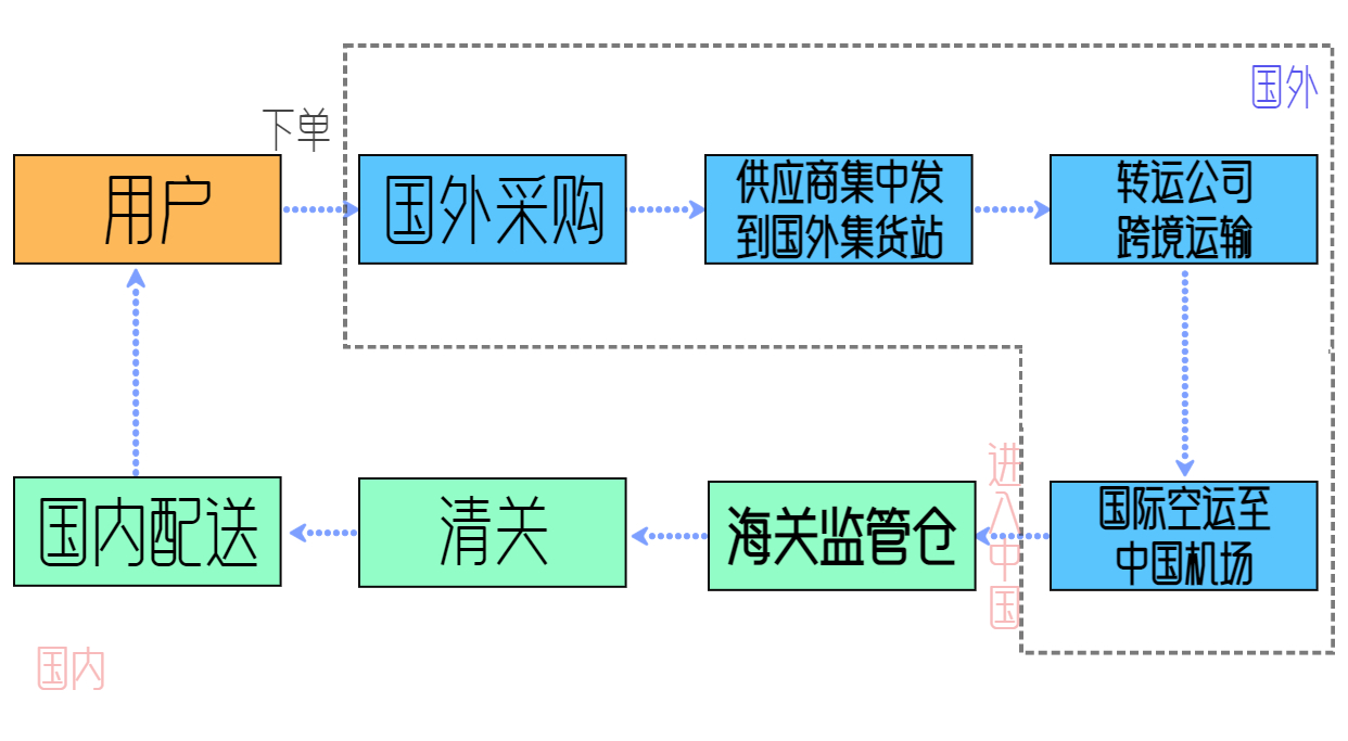 跨境電商直郵進(jìn)口模式的流程:用戶下單,訂單的相關(guān)信息會(huì)推到國外采購系統(tǒng)進(jìn)行采購,然后訂單會(huì)進(jìn)行分揀,并給包裝貼標(biāo),再通過國際商業(yè)快遞或各國郵政系統(tǒng),由國際空運(yùn)至中國國內(nèi)機(jī)場(chǎng)進(jìn)入中國。進(jìn)入中國的貨物,還需要進(jìn)入海關(guān)監(jiān)管倉進(jìn)行清關(guān)。最后,通關(guān)后的貨物會(huì)進(jìn)行國內(nèi)配送,送到用戶手上。整個(gè)流程如下圖