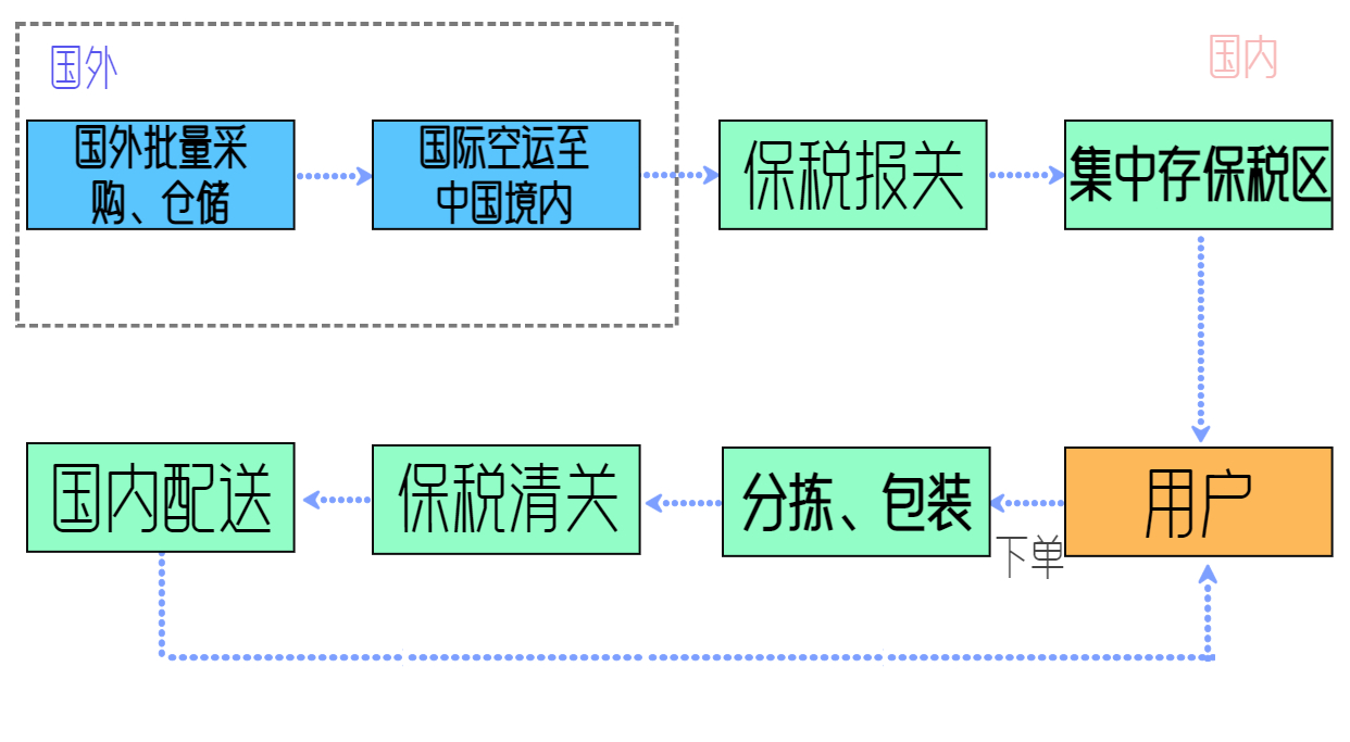 跨境電商保稅進(jìn)口模式流程:先在國外采購貨物,然后通過國際空海運(yùn)等方式將貨物運(yùn)輸進(jìn)入國內(nèi),接著進(jìn)行保稅報(bào)關(guān),并集中存放在保稅區(qū)。當(dāng)用戶下單后,訂單信息推送到海關(guān)平臺(tái),傳到貨物存儲(chǔ)處,進(jìn)行分揀、包裝貼標(biāo),最后進(jìn)行保稅清關(guān),通關(guān)后,進(jìn)行國內(nèi)配送到用戶手中。整個(gè)流程如下圖: